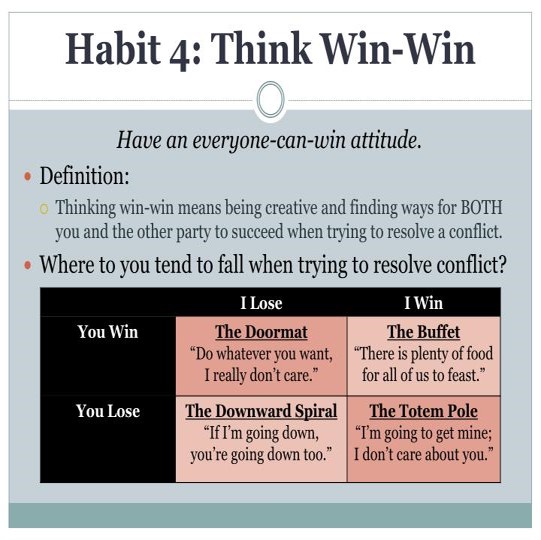 Zodra je deze onafhankelijkheid hebt bereikt, levert dit win-win situaties op in de samenwerking met anderen, hoe je actief op naar anderen kan luisteren voordat je wilt dat je begrepen wordt, zodat de nodige synnergie gerealiseerd wordt.