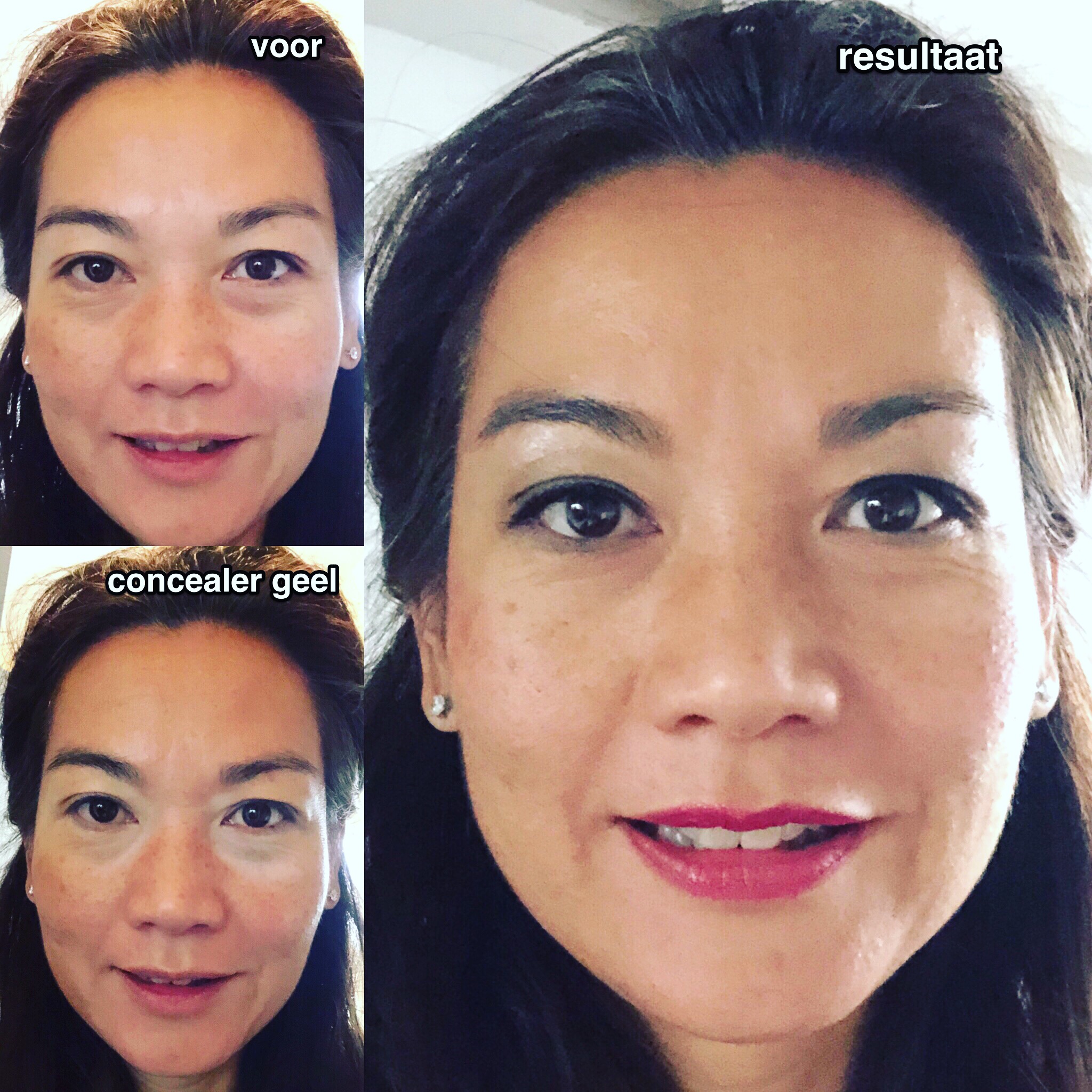 Hier zie je wat een gele concealer doet met de schaduwen onder je ogen.