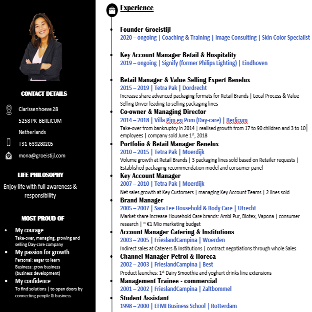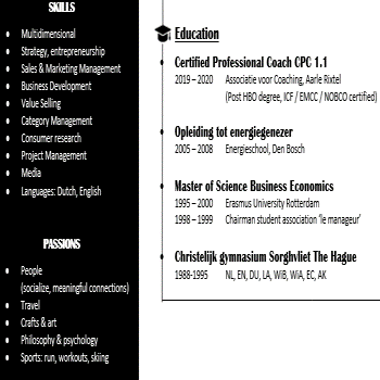 Na mijn studie BedrijfsKundige Economie aan de Erasmus Universiteit in Rotterdam ben ik als commercieel manager aan de slag gegaan bij verschillende bedrijven. Naast deze full-time jobs, heb ik mezelf breed ontwikkeld op diverse vlakken:
